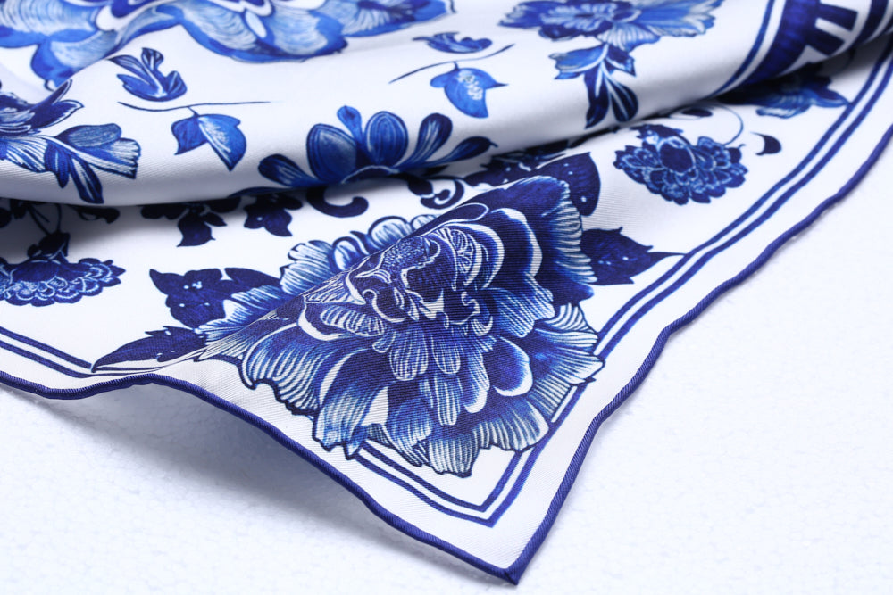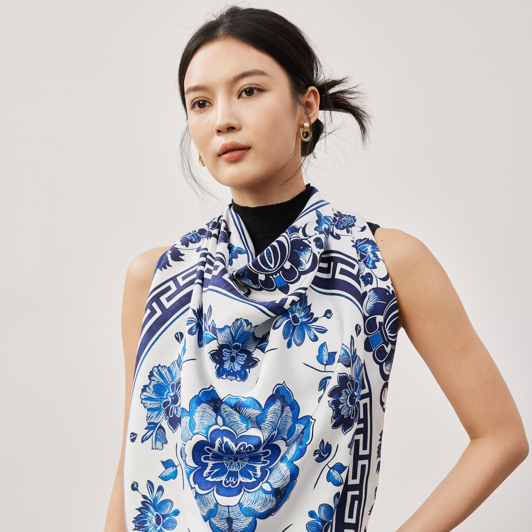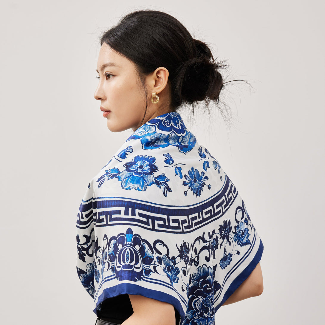 The blue and white porcelain silk scarf, which combines traditional Chinese craftsmanship with modern fashion, is a unique accessory exuding elegance and cultural significance. Inspired by classic blue-and-white porcelain patterns, this scarf showcases exquisite floral designs, seamlessly integrating the artistic beauty of ancient ceramics into contemporary life.