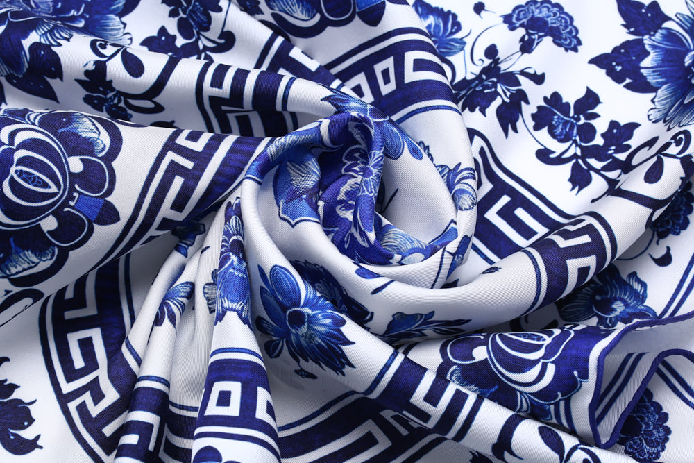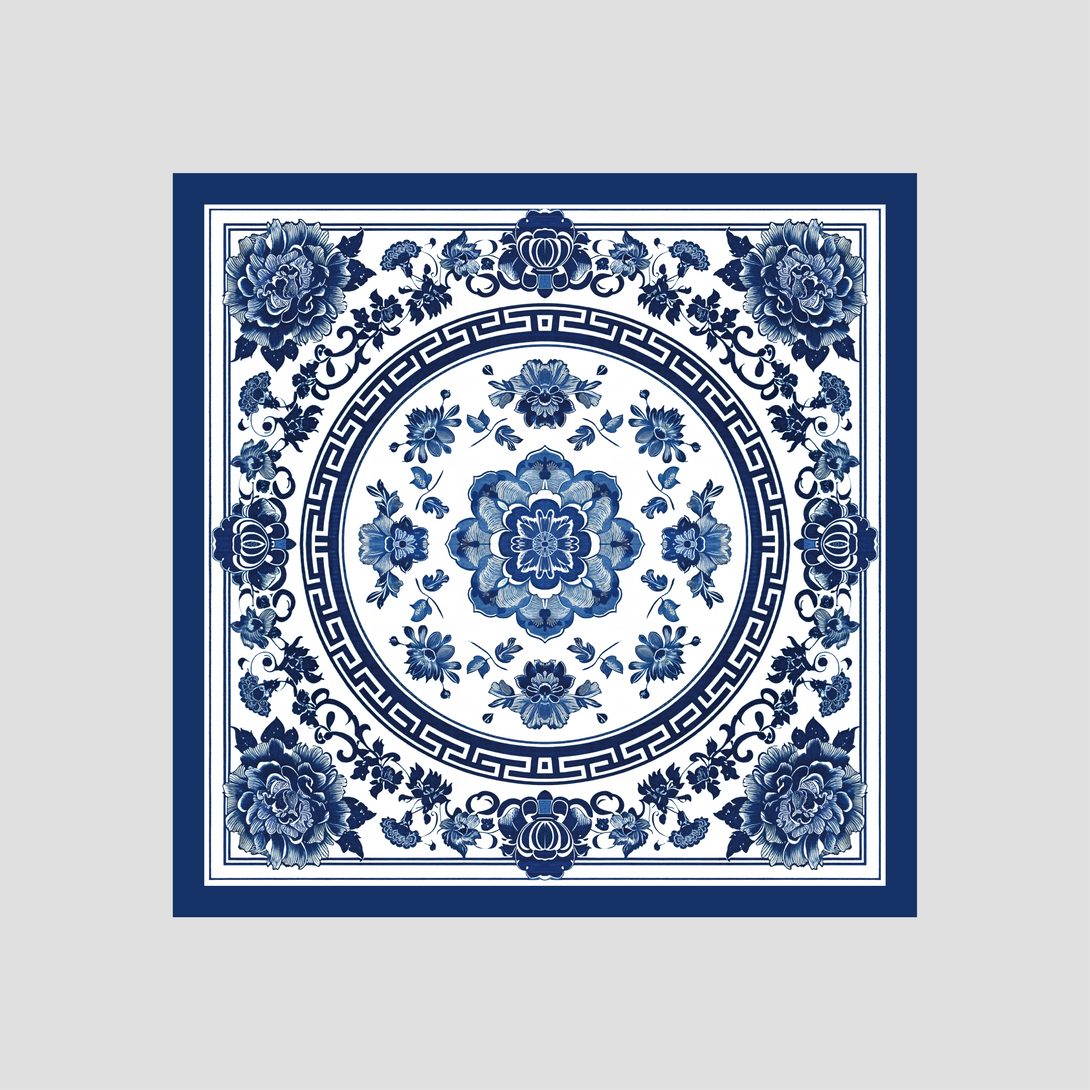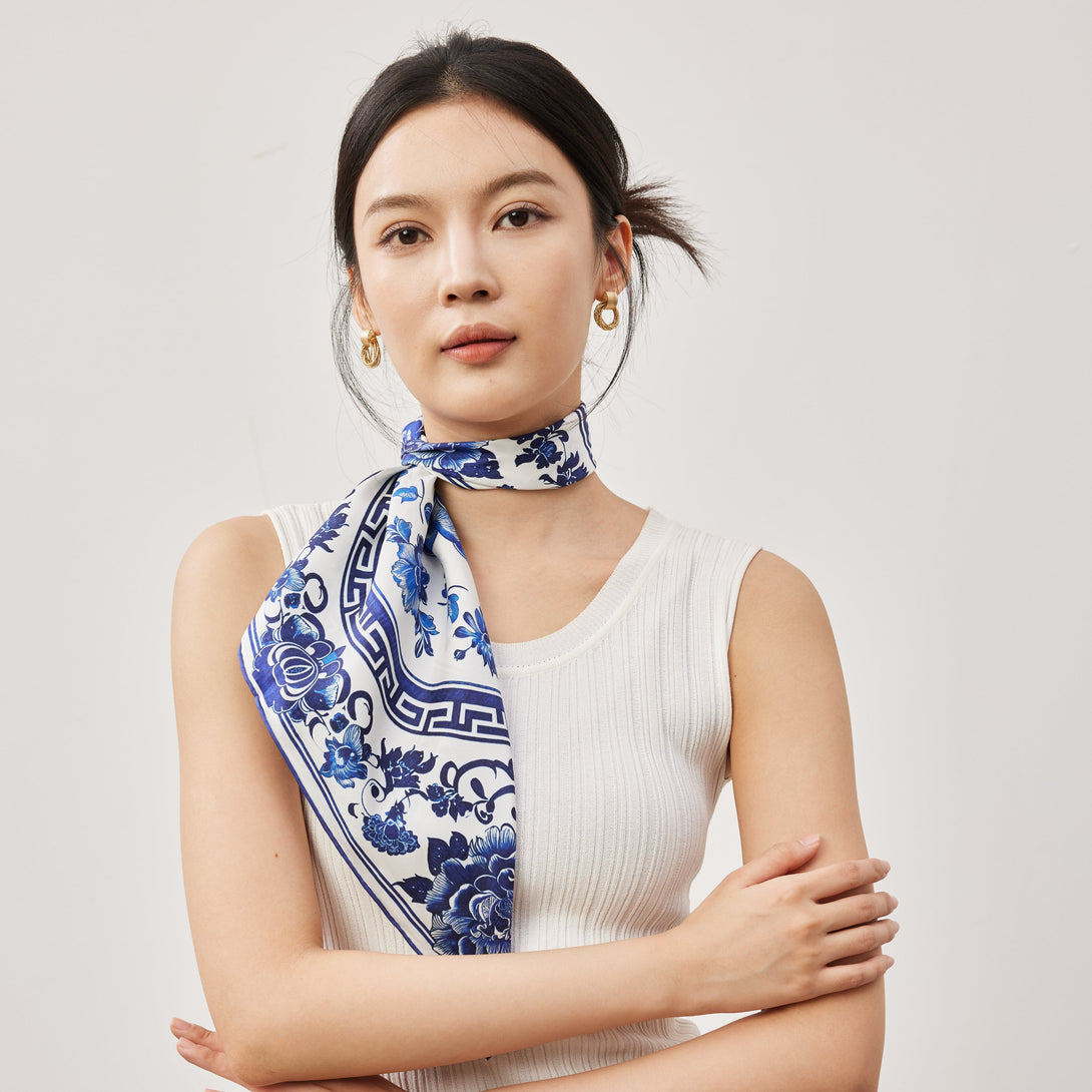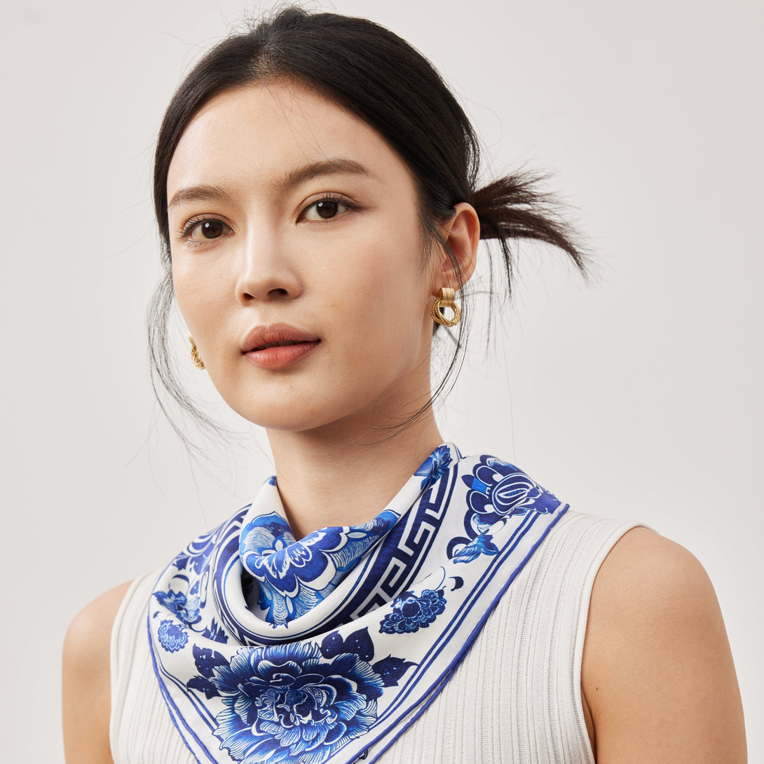 The blue and white porcelain silk scarf, which combines traditional Chinese craftsmanship with modern fashion, is a unique accessory exuding elegance and cultural significance. Inspired by classic blue-and-white porcelain patterns, this scarf showcases exquisite floral designs, seamlessly integrating the artistic beauty of ancient ceramics into contemporary life.